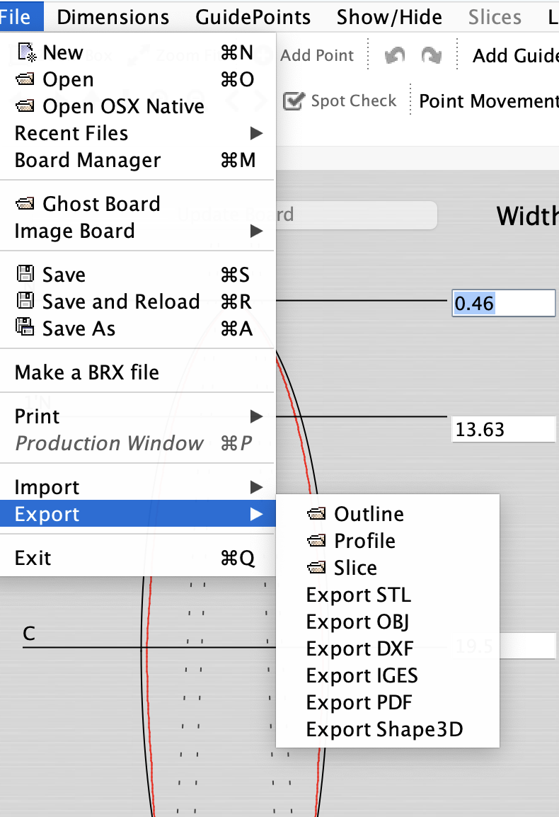 If you have access to a CNC router or laser cutter, AkuShaper allows you to export your board’s outline, rocker, and internal slices in industry-standard formats like DXF, IGES, or STL. This makes it easy to:
