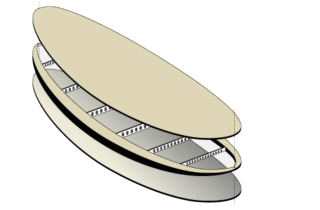 Similar to the Hollow Construction, this type of board is also hollow but doesn't have a centre spine, just horizontal ribs. Positioned to suit the riders weight, usually about 100mm to 120mm apart where the rider would stand.