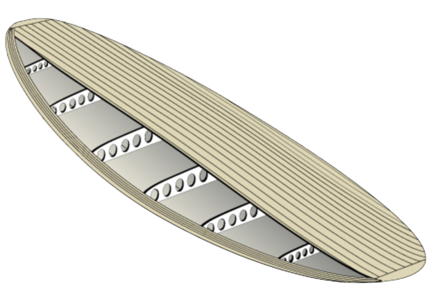 If choosing a fibreglassed finish with this type of build, the deck and bottom timbers can be 6mm thick. As the fibreglass provides structural integrity to the board. Internal ribs are spaced to suit the size of the rider, usually about 120mm to 150mm apart. Closer together where the rider will be standing.