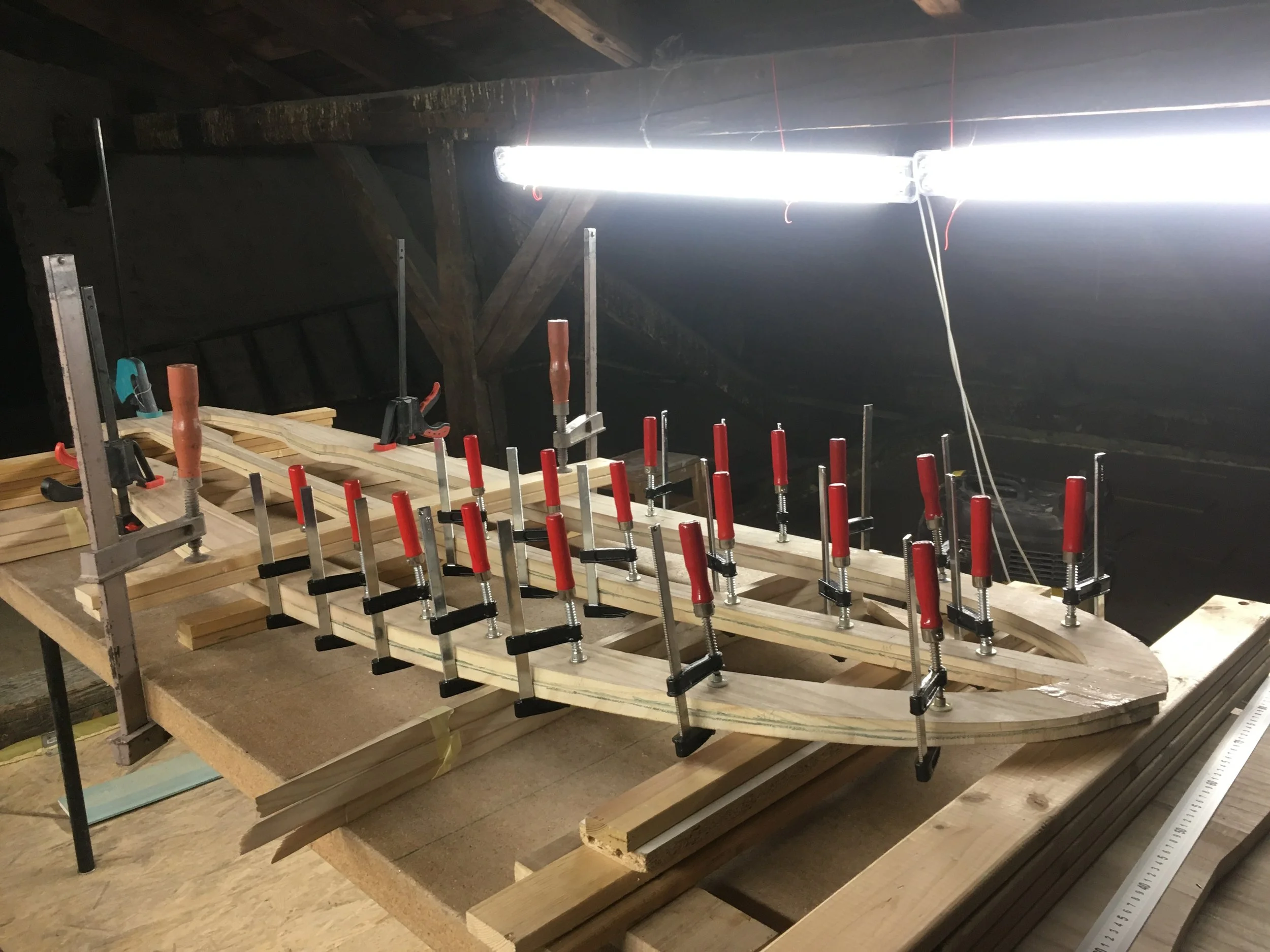 Ribs can be made from either solid timber or plywood, it has a solid rail around the perimeter which gives it its strength, clad with an outer timber skin.