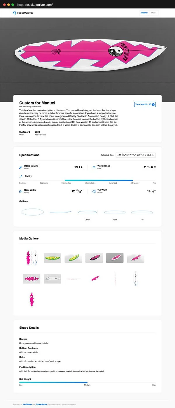 Design, visualize, and share your boards in minutes with photo-realistic imagery, 3D models, and augmented reality—directly from your AkuShaper files.